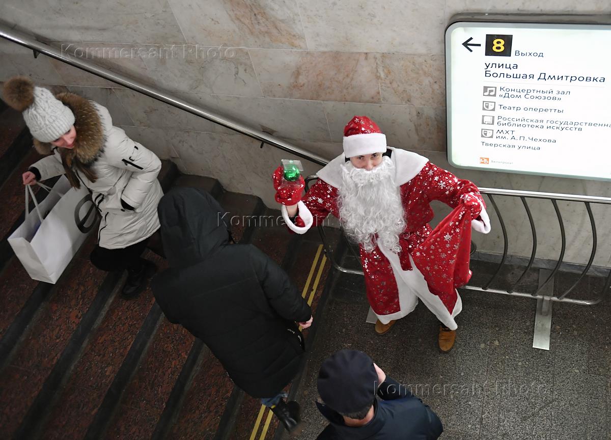 Жанровая фотография. Человек в костюме Деда Мороза в метро.