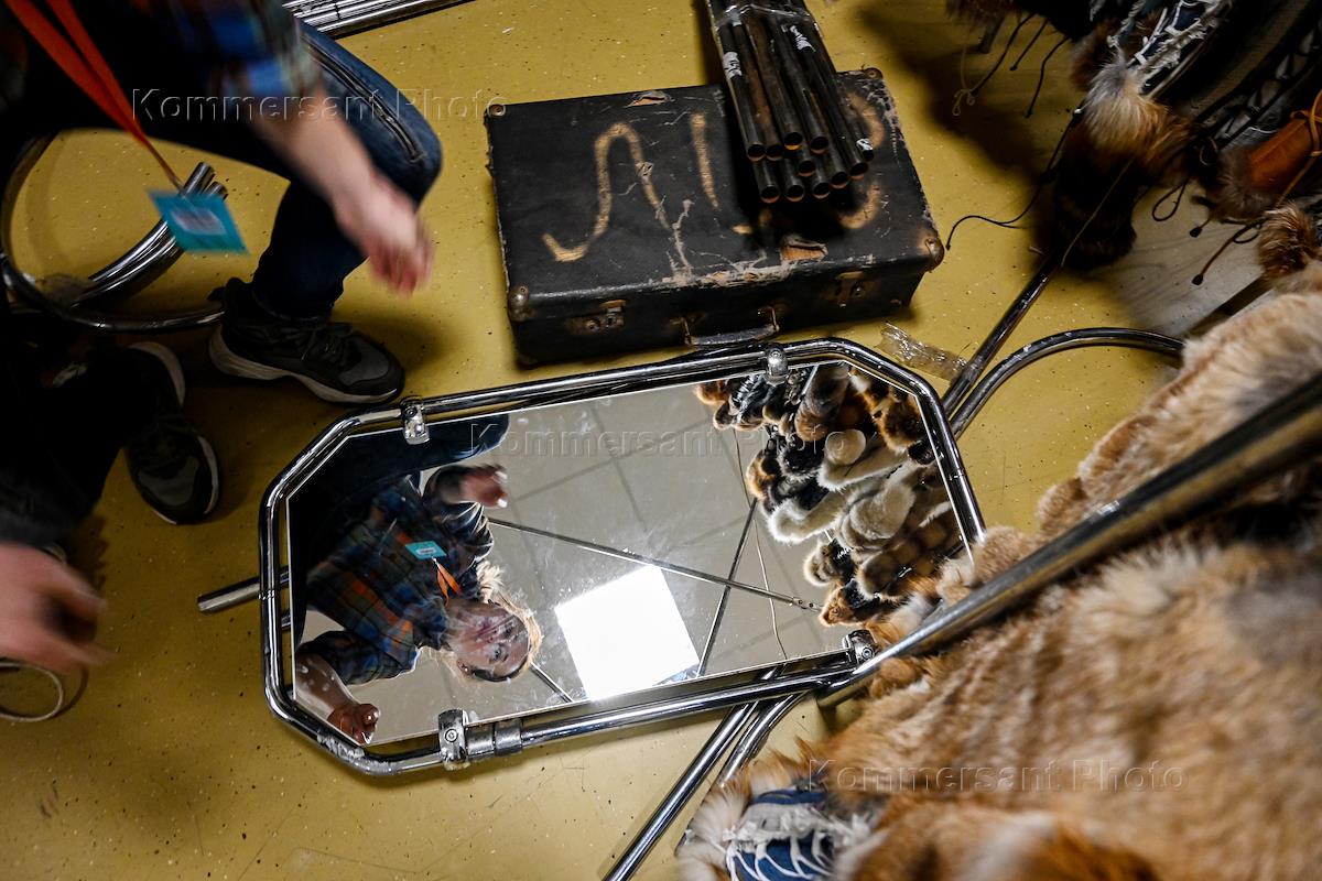 Выставка путешествий и техники для активного отдыха "Поехали 2023" в Центральном выставочном комплексе "Экспоцентр". Жанровая фотография. Девушка развешивает меховые жилеты.