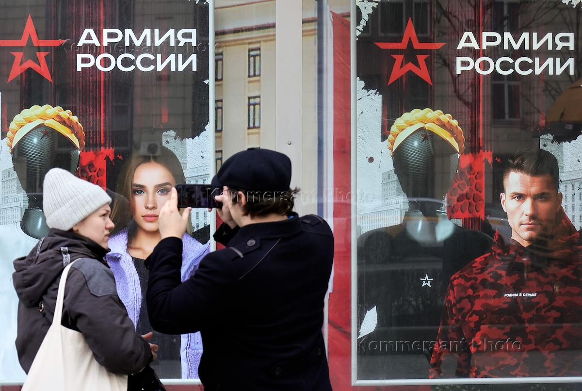 Жанровая фотография. Девушка на фоне рекламы фирменного магазина "Армия России".