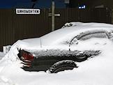 Виды поселка Петрово-Дальнее. Жанровая фотография. Занесенный снегом автомобиль у забора с табличкой "шиномонтаж".