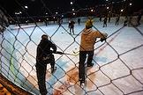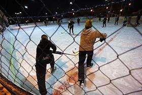 Виды поселка Петрово-Дальнее. Жанровая фотография. Дети играют в хоккей на открытой площадке.