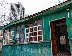 Жанровая фотография. Заброшенный дом на фоне строящегося многоэтажного дома.