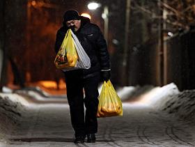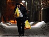 Жанровая фотография. Мужчина с апельсинами в пакетах вечером идет по аллее бульвара.