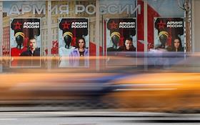 Виды Москвы. Жанровая фотография. Рекламные плакаты магазина "Армия России" с персонажами компьютерной игры Atomic Heart.