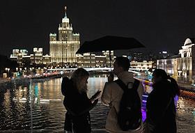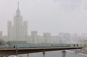 Виды Москвы. Жанровая фотография. Парящий мост Ландшафтного парка "Зарядье" над Москвой-рекой и жилая высотка на Котельнической набережной.