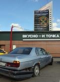 Виды Москвы. Район Северное Измайлово. Жанровая фотография. Поврежденный автомобиль на парковке у ресторана быстрого питания "Вкусно - и точка". Реклама ЧВК "Вагнер" "Поступай в команду победителей!" на высотном здании.
