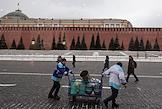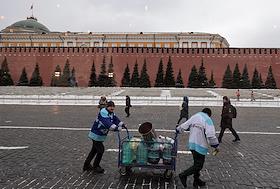 Виды Москвы. Жанровая фотография. Люди с груженой грузовой тележкой на Красной площади.