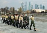 Жанровая фотография. Учащиеся кадетских классов во время подготовки к параду, посвященному 78-й годовщине Победы в Великой Отечественной войне, на Поклонной горе.