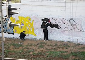Виды Москвы. Жанровая фотография. Художники граффитисты (райтеры) рисуют граффити на стене.