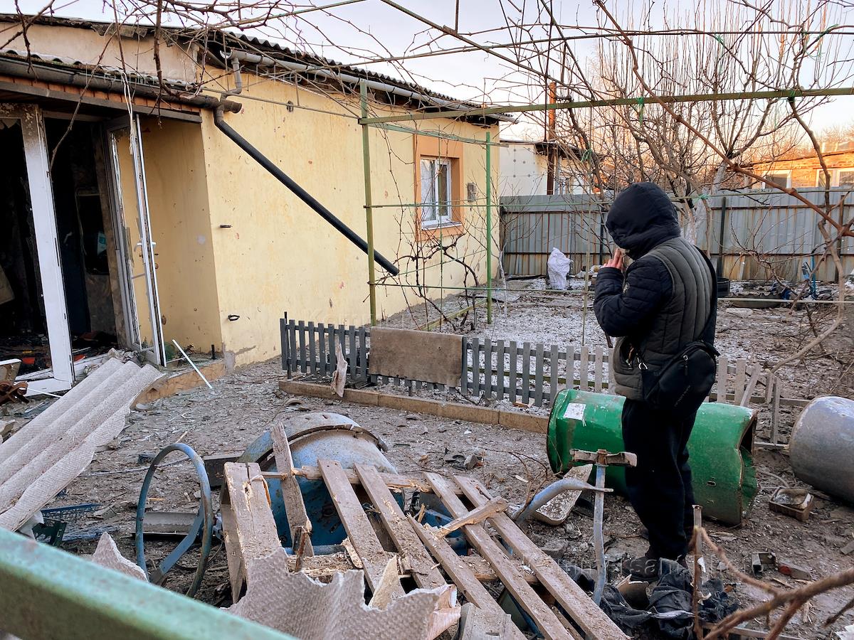 Виды Донецка во время проведения специальной военной операции Вооруженных сил России. Последствия обстрела Петровского района. Мужчина во дворе частного дома, поврежденного в результате обстрела.