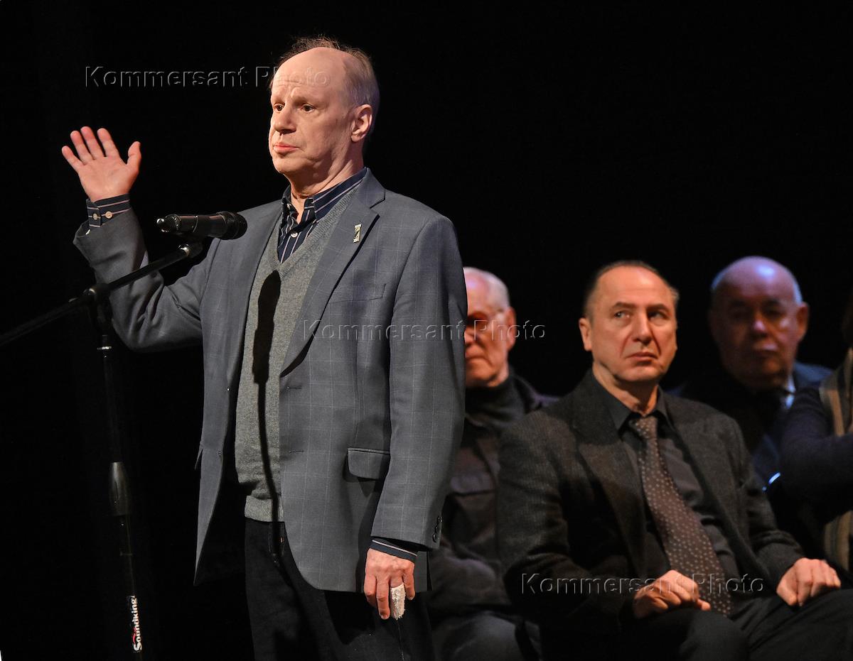 Церемония прощания с бывшим директором театра "Современник" и Московского Художественного театра имени Чехова Леонидом Эрманом в театре "Современник". Ректор Школы-студии МХАТ, актер Игорь Золотовицкий (слева) во время выступления на церемонии.