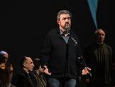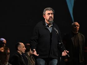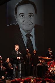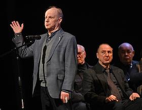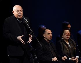 Церемония прощания с бывшим директором театра "Современник" и Московского Художественного театра имени Чехова Леонидом Эрманом в театре "Современник". Ректор Школы-студии МХАТ, актер Игорь Золотовицкий (слева) во время выступления на церемонии.