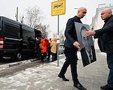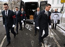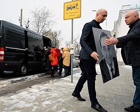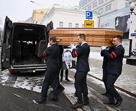 Церемония прощания с бывшим директором театра "Современник" и МХТ имени Чехова Леонидом Эрманом в театре "Современник". Вынос гроба с телом после церемонии.