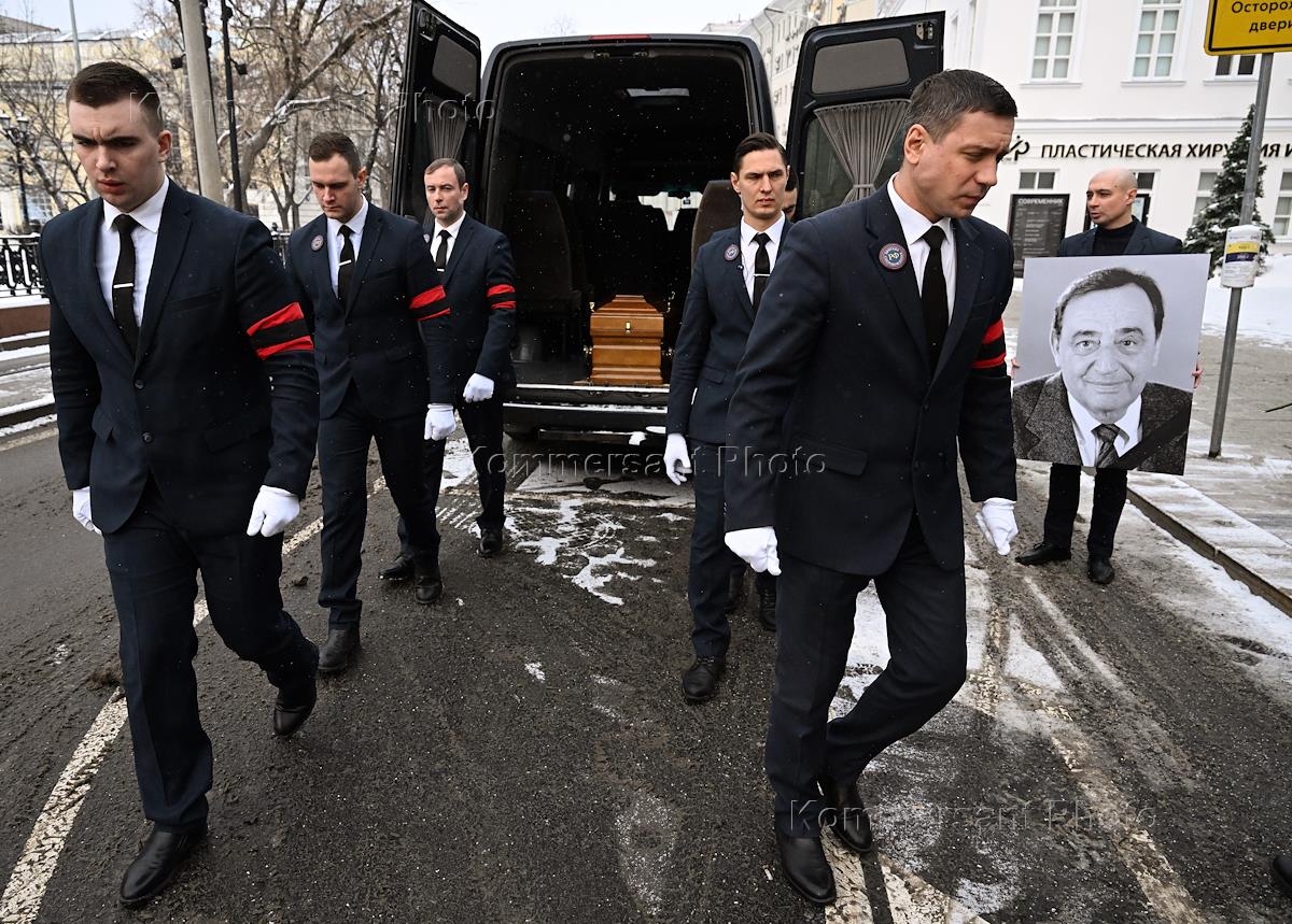 Церемония прощания с бывшим директором театра "Современник" и МХТ имени Чехова Леонидом Эрманом в театре "Современник". Вынос гроба с телом после церемонии.
