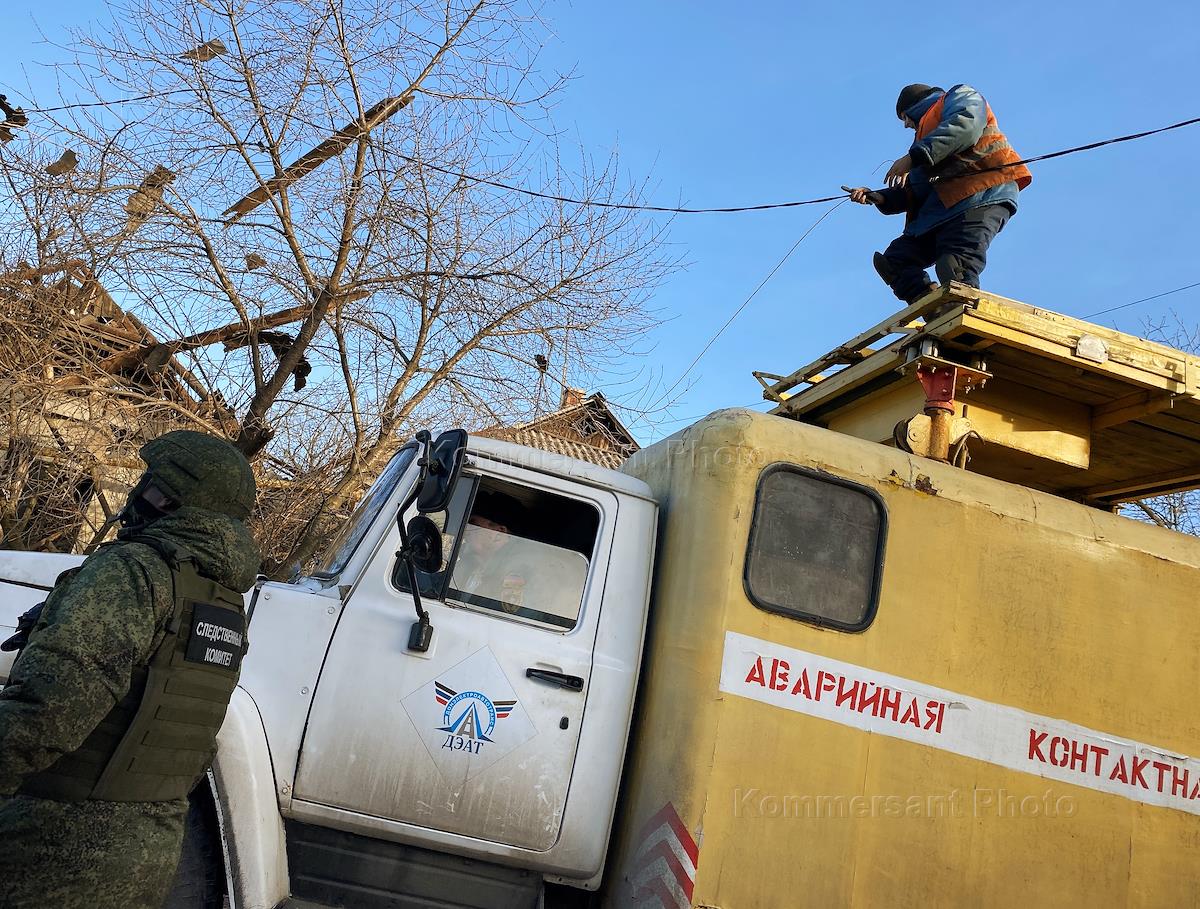 Виды Донецка во время проведения специальной военной операции Вооруженных сил России. Последствия обстрела Ленинского района Донецка. Сотрудники спецслужб во время работ по восстановлению электроснабжения.