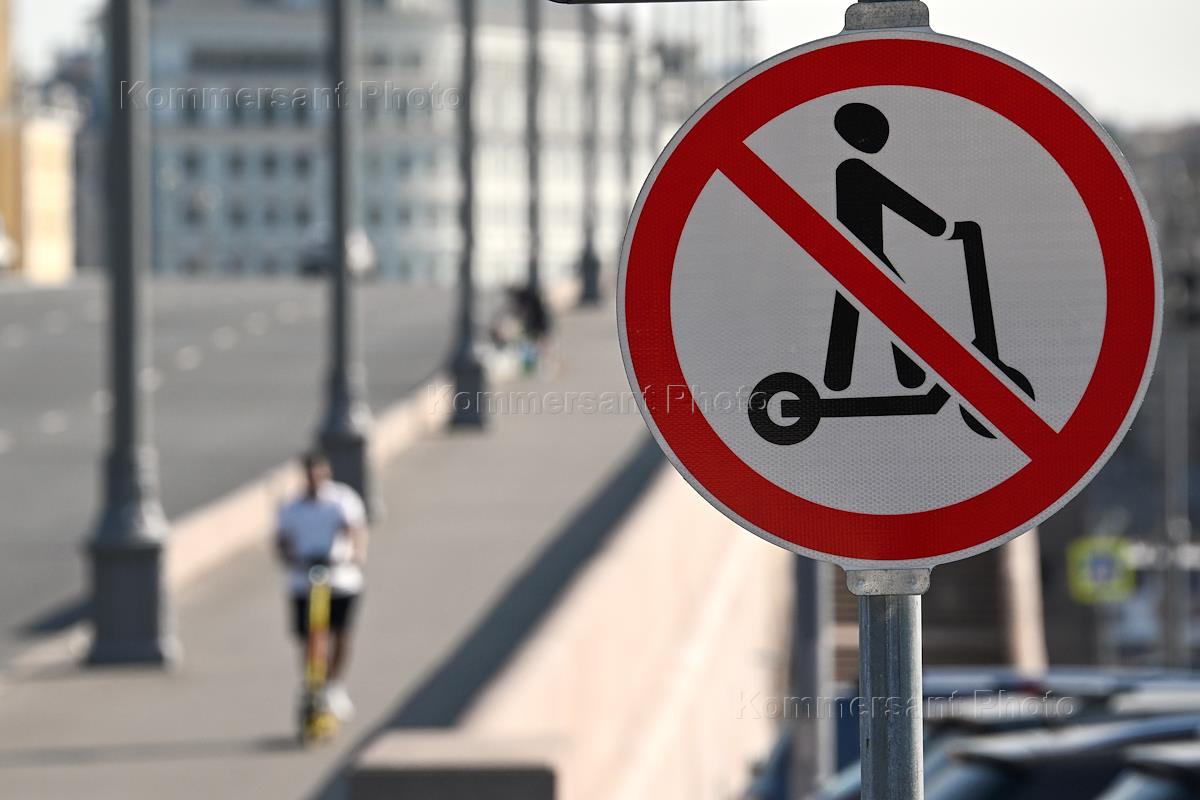 Жанровая фотография. Дорожный знак "Движение на самокатах запрещено".