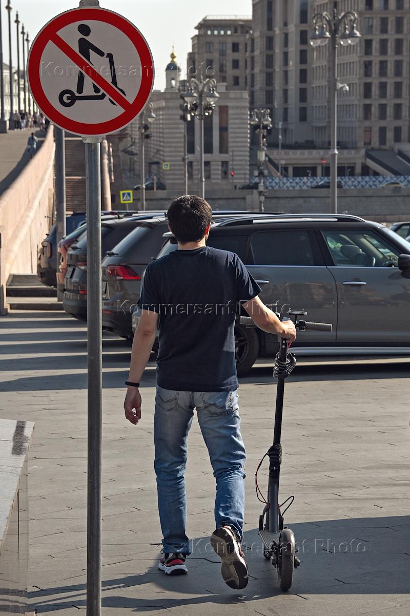 Жанровая фотография. Мужчина ведет самокат у дорожного знака "Движение на самокатах запрещено".