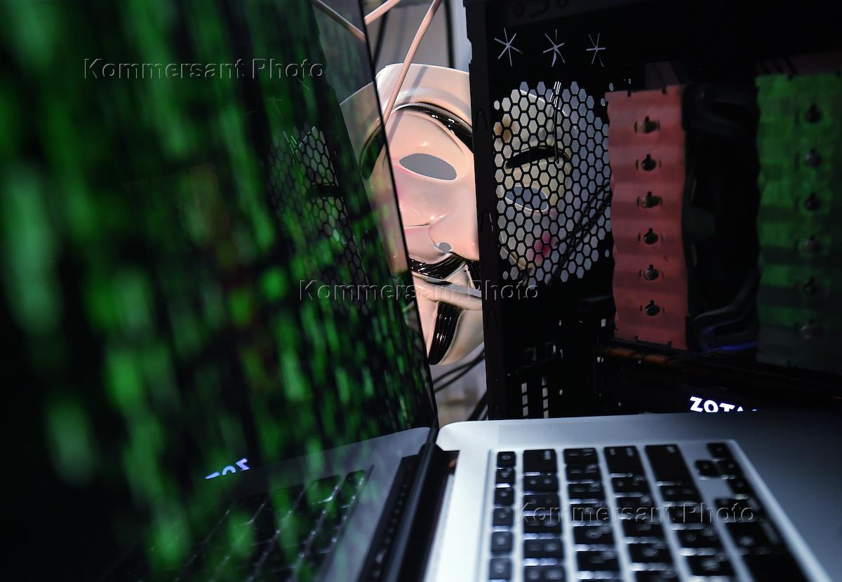 Кибербезопасность. Жанровая фотография. Маска анонима и системный блок компьютера.