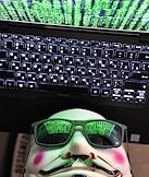 Кибербезопасность. Жанровая фотография. Маска анонима, ноутбук и системный блок компьютера.