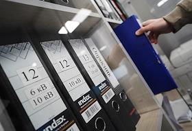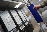 Жанровая фотография. Папки с бумагами на полке в офисе.