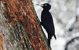 Жанровая фотография. Птица Желна (черный дятел) на стволе дерева на улице города.