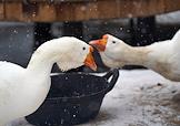 Жанровая фотография. Белые гуси в вольере городской фермы на ВДНХ.