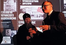 Церемония открытия выставки "Украина. На переломах эпох" в мультимедийном парке "Россия - моя история. Свердловская область". Митрополит Екатеринбургский и Верхотурский Евгений (слева) во время церемонии.