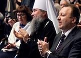 Церемония открытия выставки "Украина. На переломах эпох" в мультимедийном парке "Россия - моя история. Свердловская область". Митрополит Екатеринбургский и Верхотурский Евгений (в центре) и заместитель полномочного представителя президента России в УрФО Борис Кириллов (справа) во время церемонии.