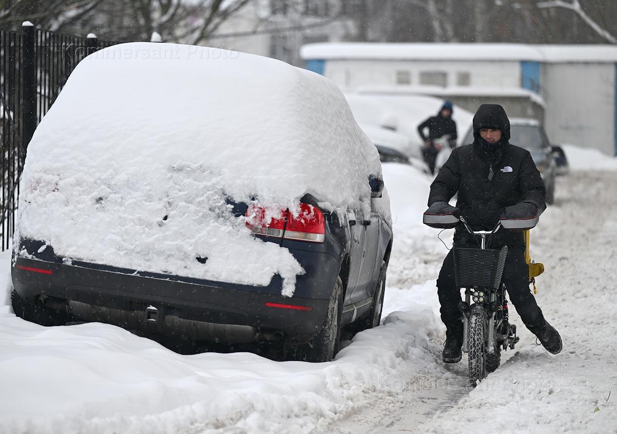 Жанровая фотография. Курьер службы доставки "Яндекс. Еда" едет на велосипеде по заснеженной улице.