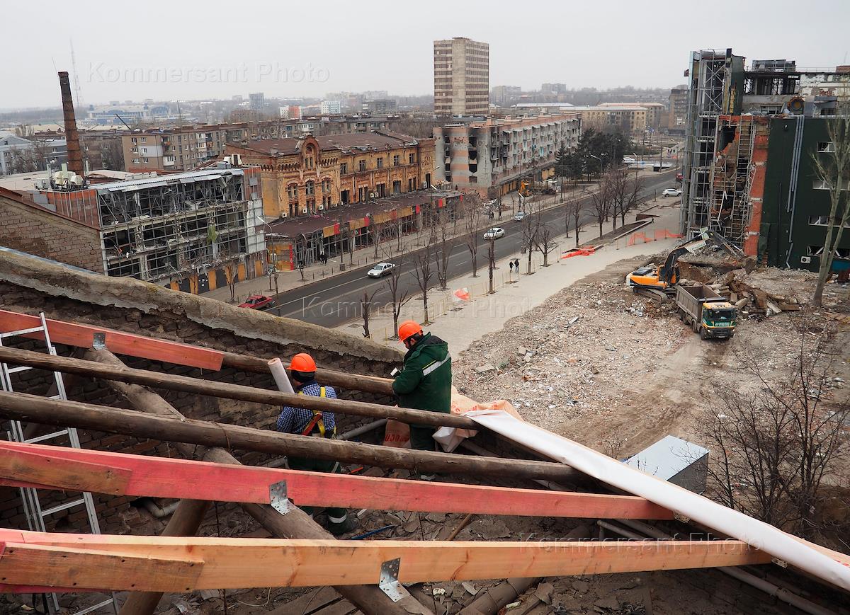 Views of Mariupol during a special military operation of the Russian Armed Forces. Builders restore the roof of a residential building.
