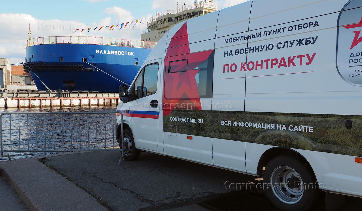Виды Санкт-Петербурга. Жанровая фотография. Мобильный пункт по отбору на воинскую службы по контракту на набережной Лейтенанта Шмидта и ледокол "Владивосток" у причала во время фестиваля ледоколов.