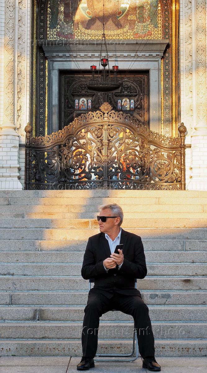 Виды Кронштадта. Жанровая фотография. Мужчина сидит на раскладном стуле на фоне лестницы и входа в Ставропигиальный Никольский Морской собор.