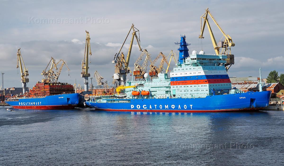 Nuclear-powered icebreakers "Yakutia" and "Ural" at the outbuilding wall of the Baltic Shipyard on the Neva River.