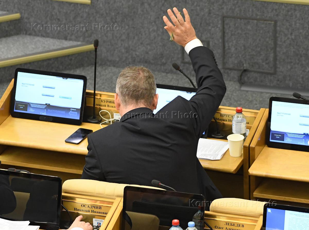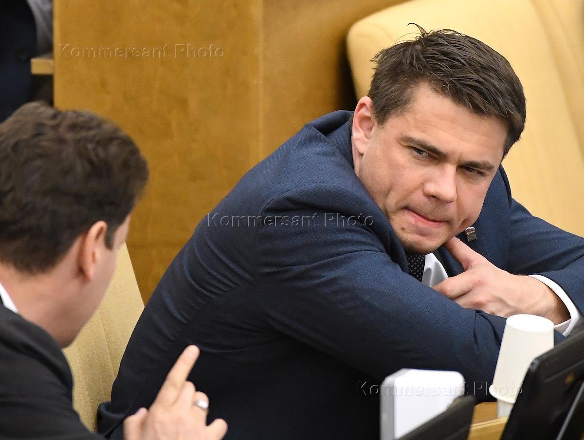 Пленарное заседание Государственной думы (ГД) России. Первый заместитель председателя комитета ГД России по экономической политике Денис Кравченко (справа) во время заседания.