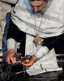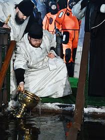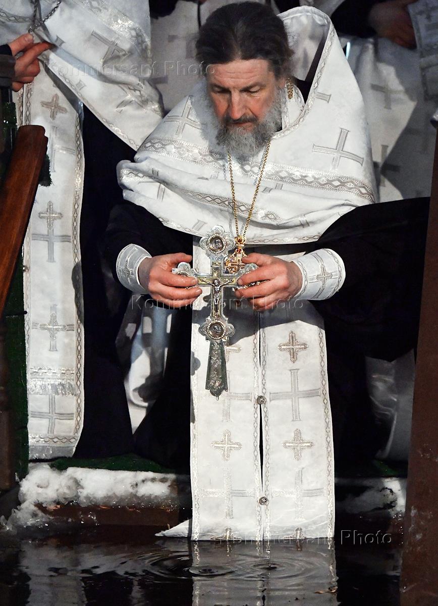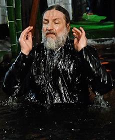 Праздник Крещения Господня. Крещенские купания в Дворцовом пруду парка "Останкино". Священнослужитель во время купания в купели.