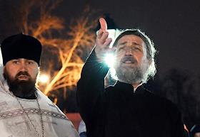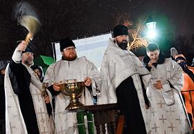 Праздник Крещения Господня. Крещенские купания в Дворцовом пруду парка "Останкино". Православные священники во время освящения купели.