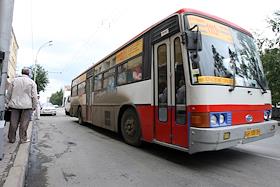 Частный коммерческий автобус на остановке общественного транспорта, на Красном проспекте в Новосибирске.