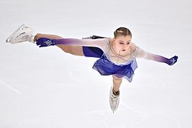 Кубок Первого канала 2023 по фигурному катанию в Многофункциональном спортивном комплексе (МСК) "ЦСКА Арена". Командный турнир. Короткая программа. Женщины. Фигуристка Софья Самоделкина во время выступления за команду "Нас не догонят".