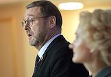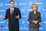 Пресс-подход заместителя председателя Совета Федерации (СФ) России Константина Косачева и заместителя председателя Государственной думы России Ирины Яровой после заседания парламентской комиссии по расследованию деятельности биолабораторий США на Украине в СФ России. Заместитель председателя СФ России Константин Косачев (слева) и заместитель председателя ГД России Ирина Яровая (справа) во время пресс-подхода.