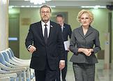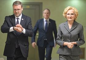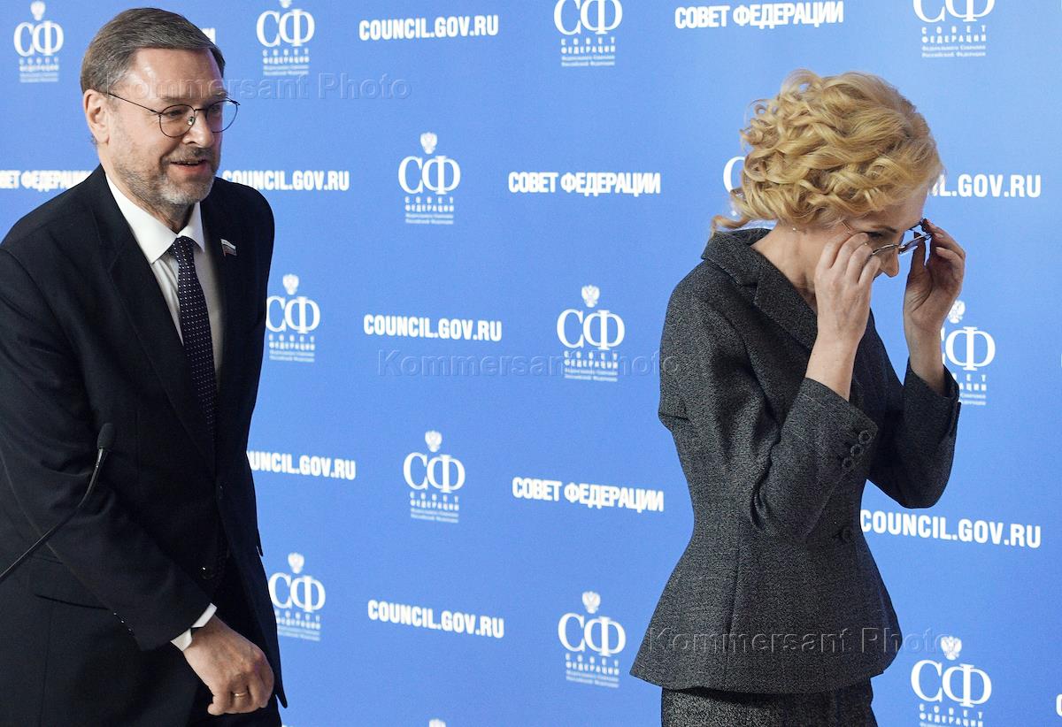 Пресс-подход заместителя председателя Совета Федерации (СФ) России Константина Косачева и заместителя председателя Государственной думы России Ирины Яровой после заседания парламентской комиссии по расследованию деятельности биолабораторий США на Украине в СФ России. Заместитель председателя СФ России Константин Косачев (слева) и заместитель председателя ГД России Ирина Яровая (справа) перед началом пресс-подхода.