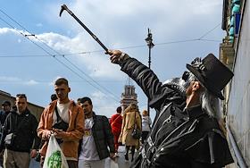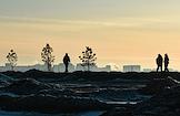 Виды Санкт-Петербурга. Жанровая фотография. Женщины в кокошниках и мужчина в костюме Ангела прогуливаются по берегу Финского залива в районе Репино.