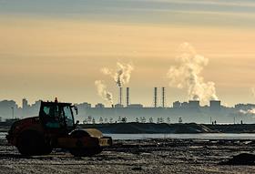 Виды Санкт-Петербурга. Жанровая фотография. Открытая набережная у "Лахта Центр" . Работники коммунальных служб приводят в порядок зеркальный элемент "Перо".
