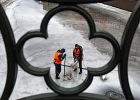 Жанровая фотография. Оттепель в городе. Работники коммунальных служб убирают мусор со льда реки Мойки.