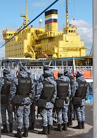 Фестиваль ледоколов на набережной Лейтенанта Шмидта. Жанровая фотография. Сотрудники Росгвардии на флоне ледокола.
