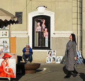 Жанровая фотография. Прохожие на Невском проспекте. Работы уличного художника.