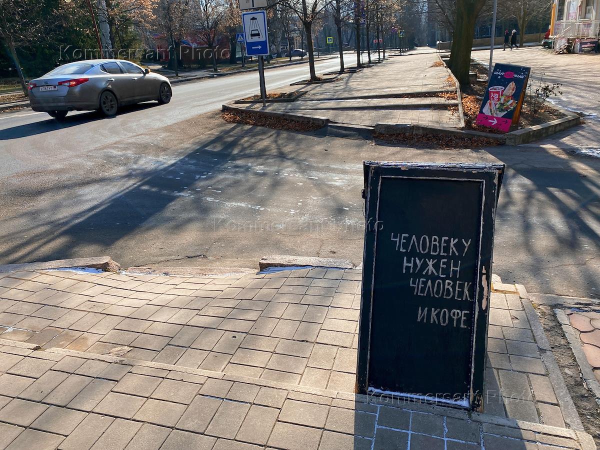 Views of Donetsk during a special military operation of the Russian Armed Forces. Genre photography. Coffee house advertising stand "A person needs a person and coffee."
