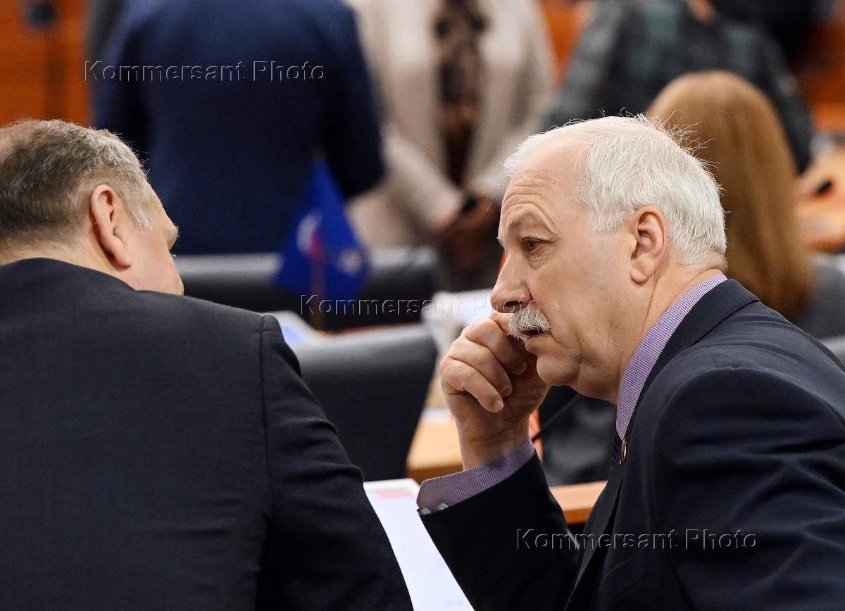 Пленарное заседание Московской городской думы (Мосгордума). Руководитель фракции КПРФ в Мосгордуме Николай Зубрилин (справа) во время заседания.
