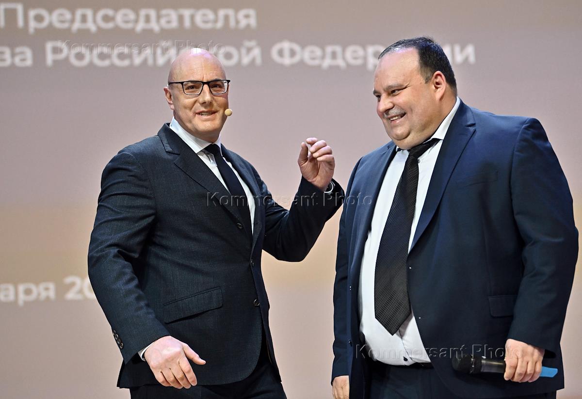 День российского студенчества ("Татьянин день") в Финансовом университете при правительстве России. Заместитель председателя правительства России Дмитрий Чернышенко (слева) и ректор Финансового университета при при правительстве России Станислав Прокофьев (справа) во время выступления перед студентами.