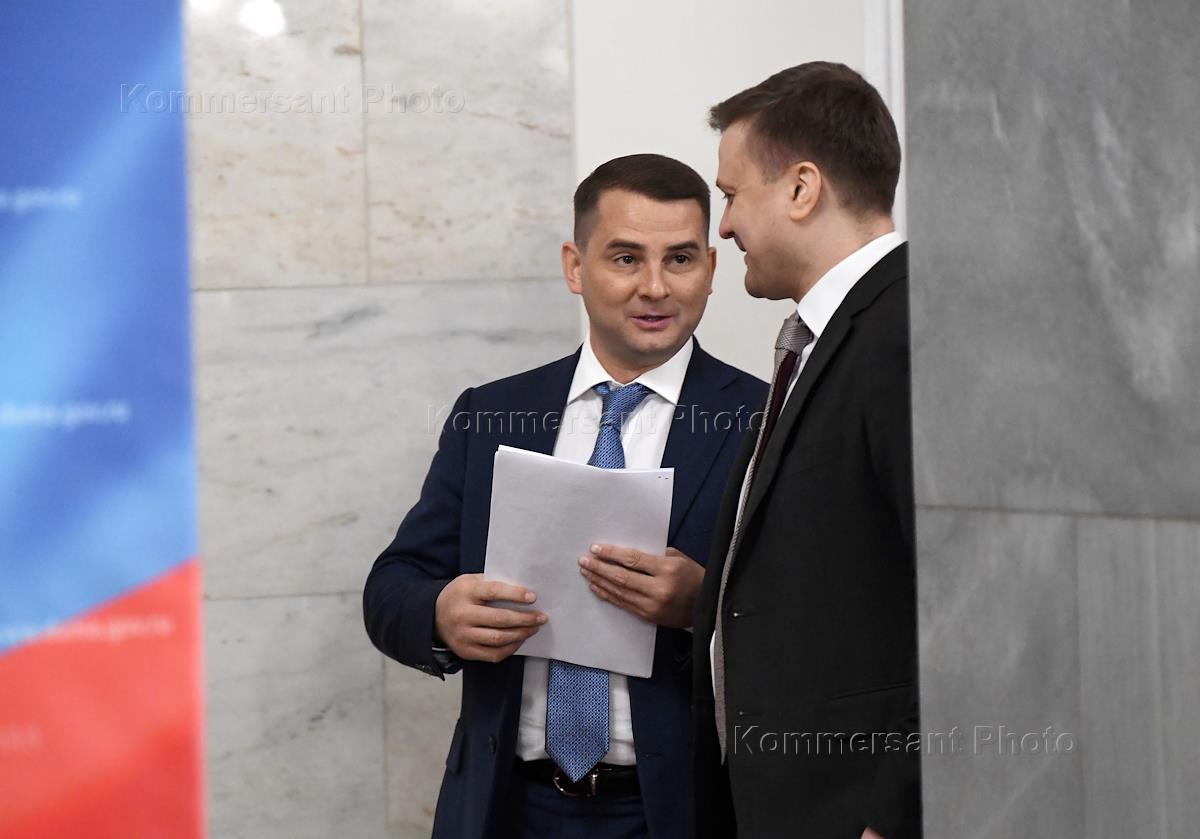 Plenary session of the State Duma of Russia. Chairman of the Russian State Duma Committee on Control Oleg Morozov (left) and Chairman of the Russian State Duma Committee on Economic Policy Maxim Topilin (right) before the meeting.