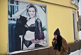 Жанровая фотография. Девушка идет по улице у здание магазина. Реклама магазина нижнего белья на стене магазина.